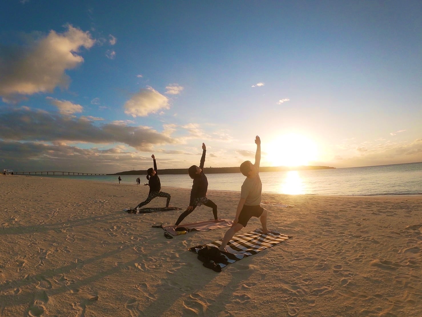 ビーチで行うヨガマットは砂浜の温度や感触を感じられる、地球に優しいマットを使用。(無料貸出)